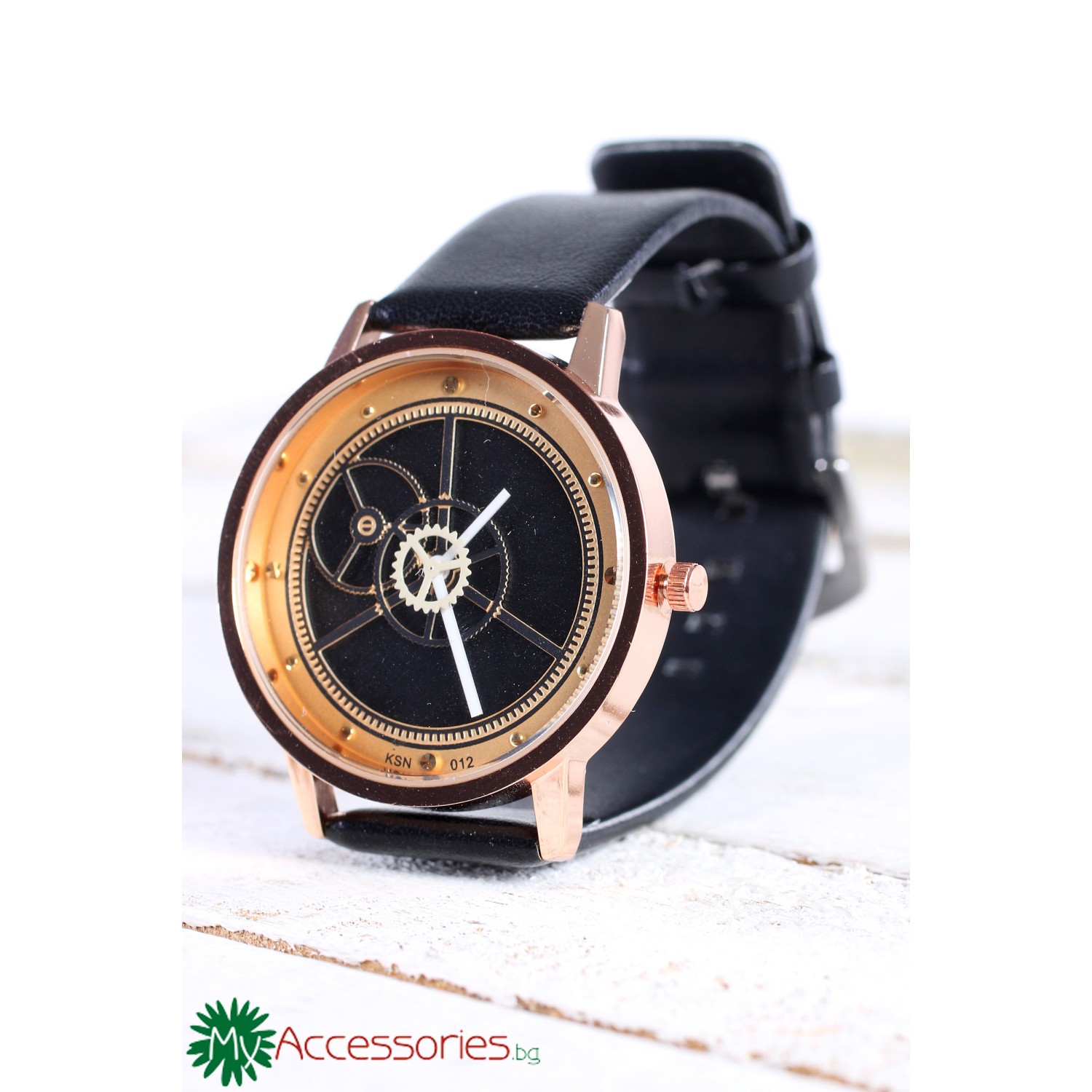 Златисто-черен циферблат.Черна кожена каишка .