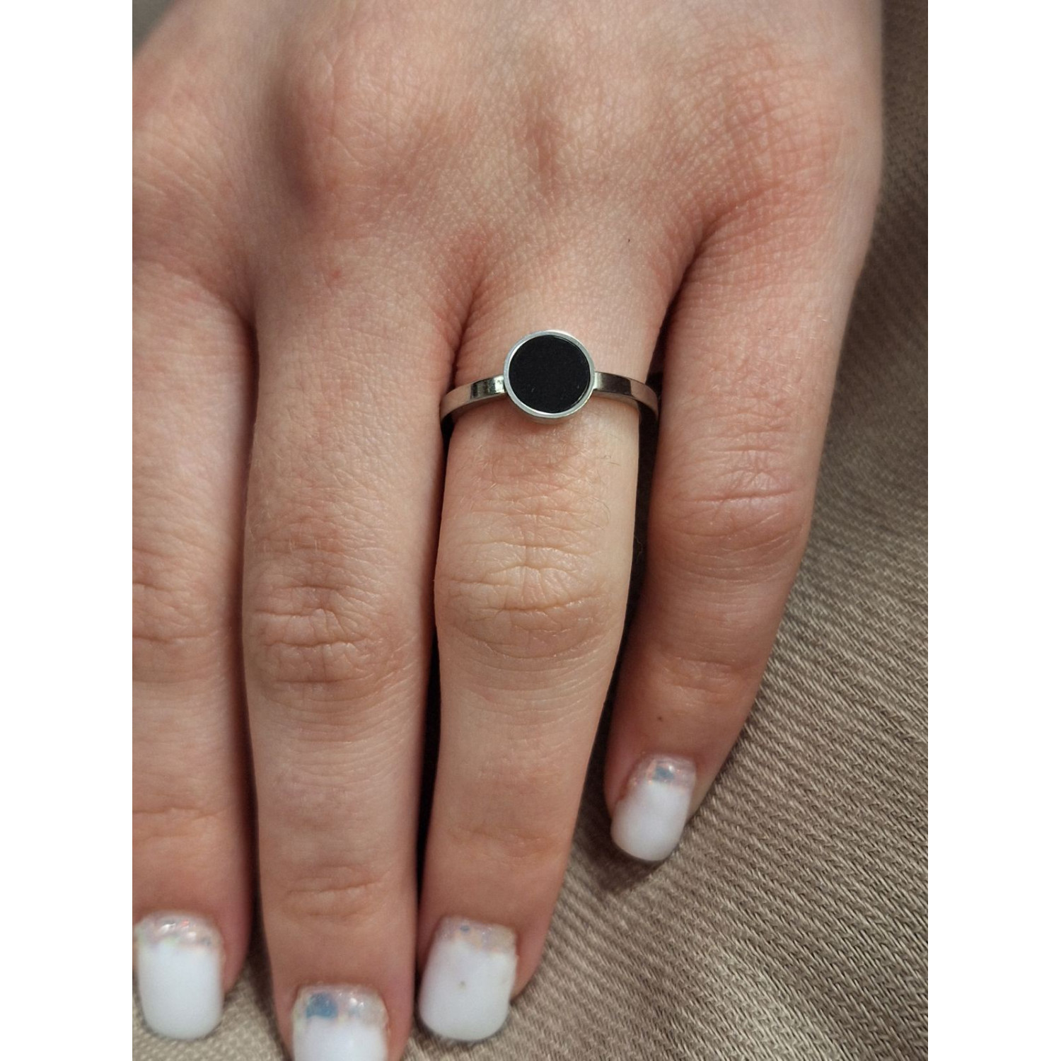 Нежен сребрист стоманен пръстен с черен камък.